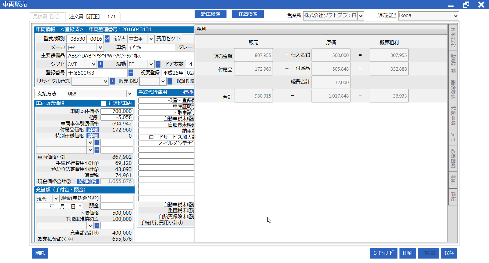 在庫車両の車両販売の見積書作成時に、付属品原価を加算した粗利金額を表示できるようにしました。
